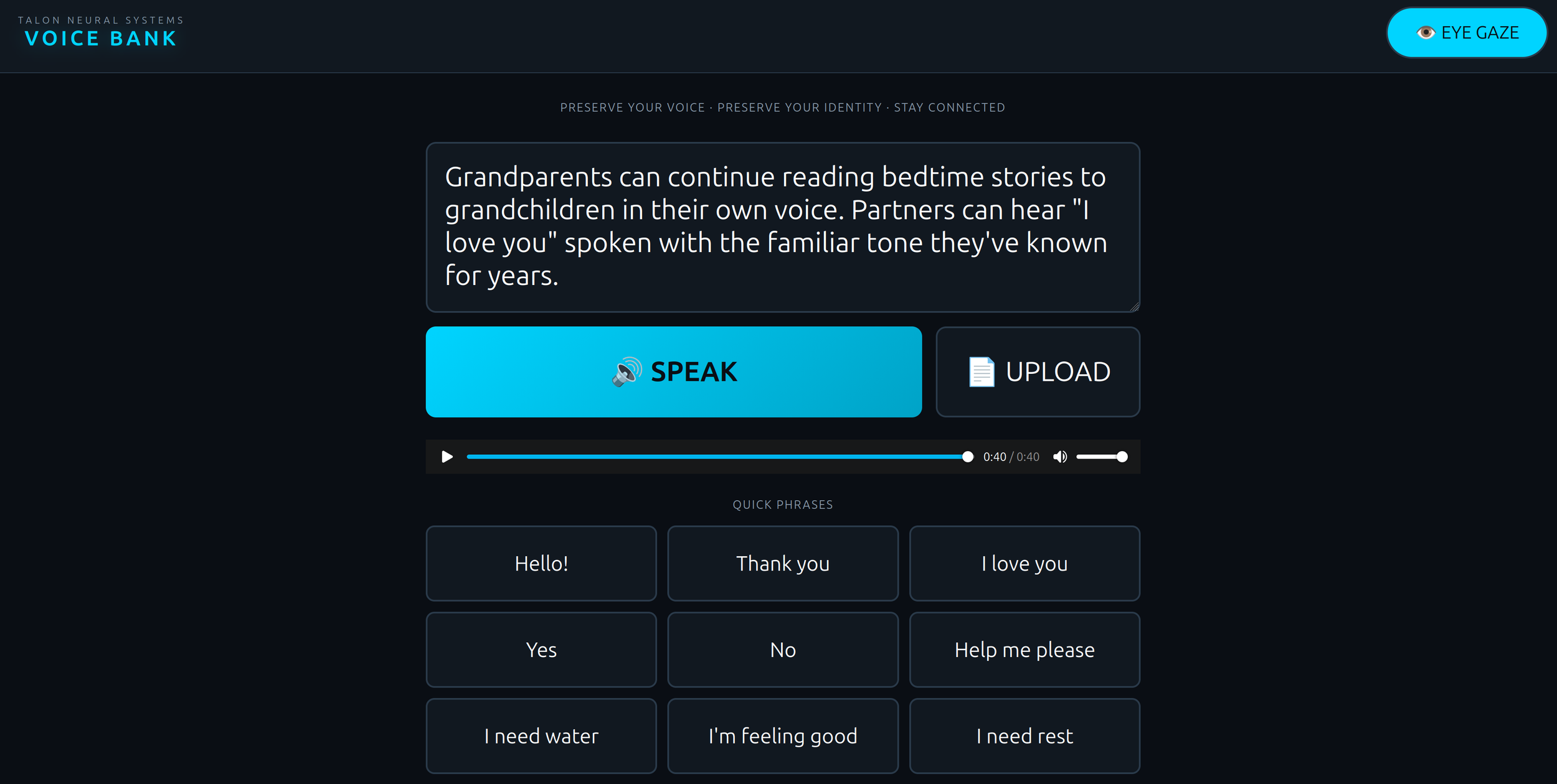 Current brain-computer interface (BCI) solutions present difficult tradeoffs. Invasive systems require risky neurosurgical implantation. Non-invasive approaches have historically been limited to simple binary (yes/no) classification, inadequate for expressing the full range of human needs—from basic care requests to emotional states to medical concerns. Meanwhile, generic synthetic voices strip away the personality and warmth that define how we connect with loved ones.